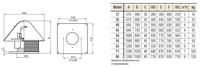 Ventiliatoriai yra 7 skirtingų dydžių su skirtingais sparnuočių diametrais nuo 310mm iki 710mm.