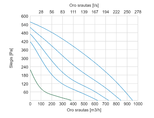 Sparnuotė: atgal lenktais sparneliais, plastmasinė. Variklis: išorinis rotorius, integruota termokontaktinė variklio apsauga, ilgai tarnaujantys nereikalaujantys priežiūros guoliai. Korpusas: dažytas RAL 9005.